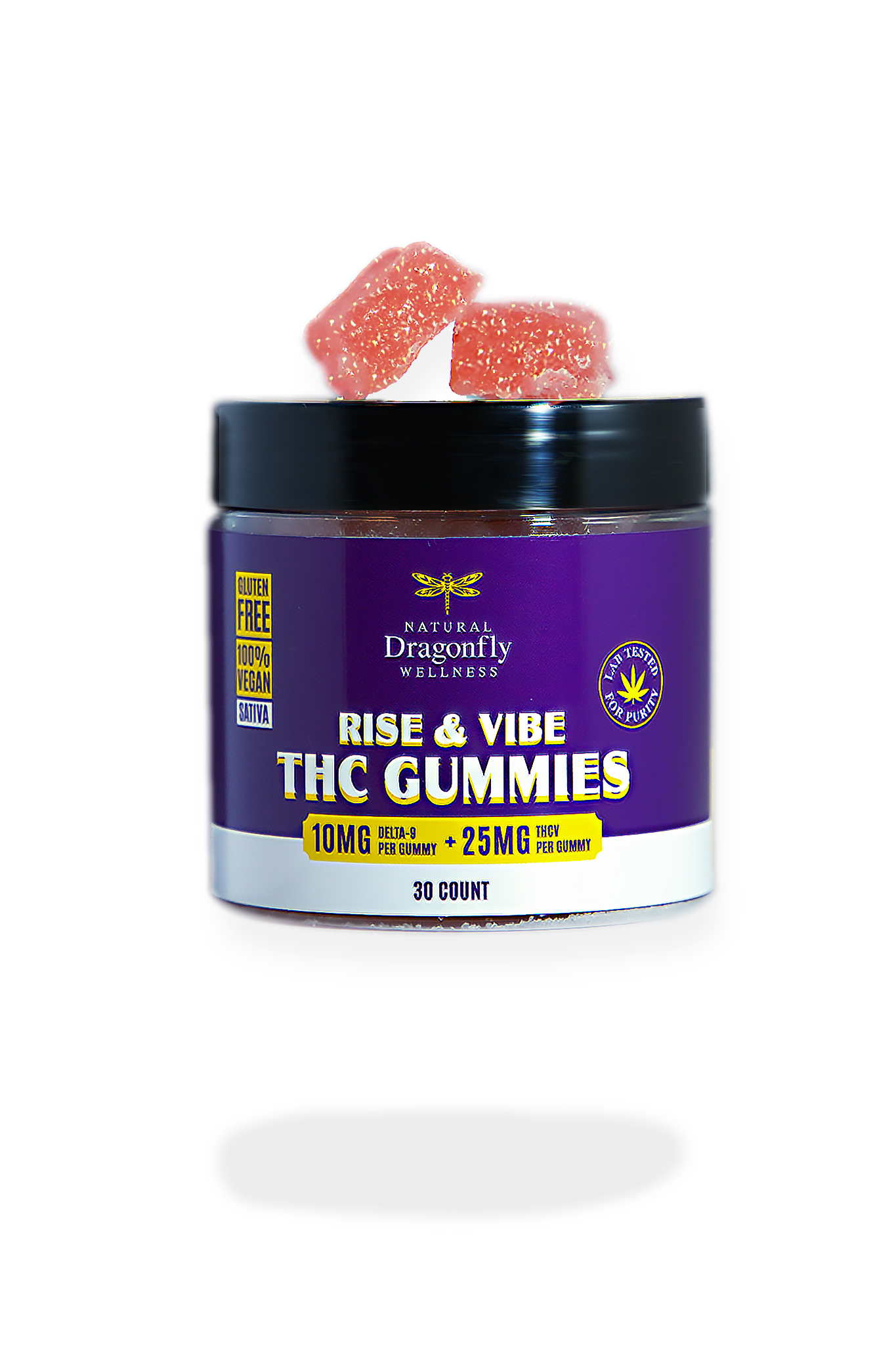 Our strawberry flavored, Rise & Vibe Gummies are a perfect combination of 10mg Delta-9 THC + 25mg THCV. These gummies are great for a heady daytime high. The THCV is stimulating, with a boost of energy and clarity.